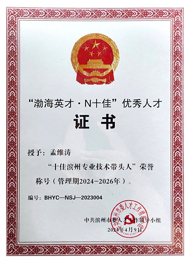 經(jīng)中共濱州市委人才工作領(lǐng)導(dǎo)小組嚴(yán)格評選,公司員工孟維濤榮獲“十佳濱州專業(yè)技術(shù)帶頭人”榮譽稱號。